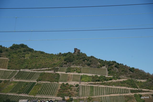山の斜面にブドウ畑が張り付いて、時折ポツンと"石"が載ってる。見える風景はずーーーとこんな感じ。ずーっと走り続けてきたので、Bachharachで一休み。